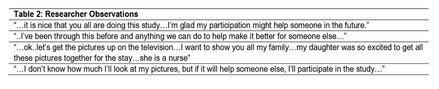 This nurse expressed an overall positive view of the study and particularly noted how it often facilitated conversations between staff and participants (discussing various pictures that were on display), but did not facilitate conversations about the participant’s current health situation. In other words, patients seemed to enjoy the positive distraction and talking with staff about the family members the staff may have not met during a family visit.