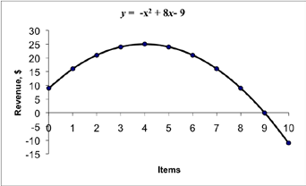 Students were asked to write a formula of the relationship between total revenue from a single customer (y) and the number of items that have been purchased (x) and to draw a graph. Table 1 shows that the formula is y = -1x2+8x+9, and the graph is a parabola shown in Figure 2. Students were asked also to suggest different conditions of a sale and to develop Table 1 and Figures 1 and 2 correspondingly. The author noticed a positive impact on students’ perceptions of the topic while performing this activity.