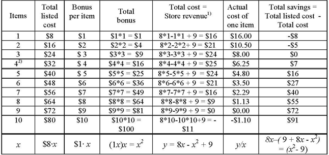 A store announces a sale with the following conditions: The buyer must purchase a sales coupon that costs $9. However, he receives $1 as cash back when purchasing a single item, $2 cash back for each item when purchasing two, $3 off on each item when purchasing three and so on. This means that the bonus per item is proportional to the number of item purchased. For simplicity, it is assumed that the listed price of every item is $8 – a simplification that allows us to better investigate the case study.