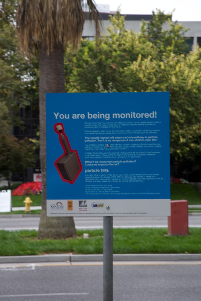 Figure 2: Particle Falls provides a real time visualization of particulate pollution in the San Fernando Corridor, Billboard announcing art Installation. source: http://01sj.org/2010/artworks/particle-falls/