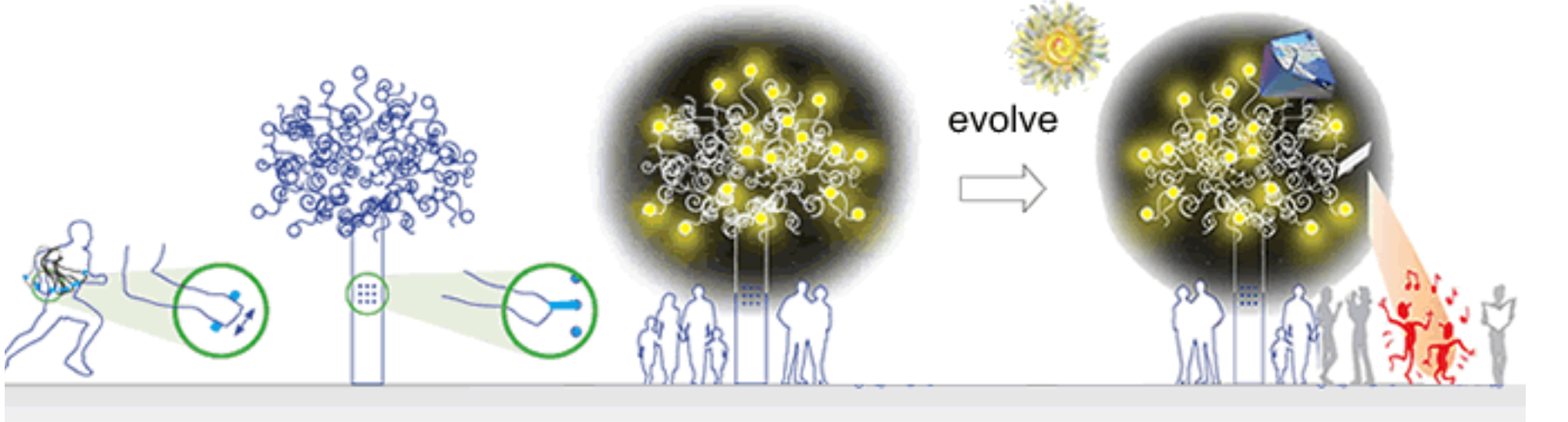 Figure 3: World City Trees Project by Jechiam Gural, Elwin Nuyts, and Ami Ikan (2012)). Human energy becomes public light for trees. The piece plays with the relationship between healthy movement and useful energy.3