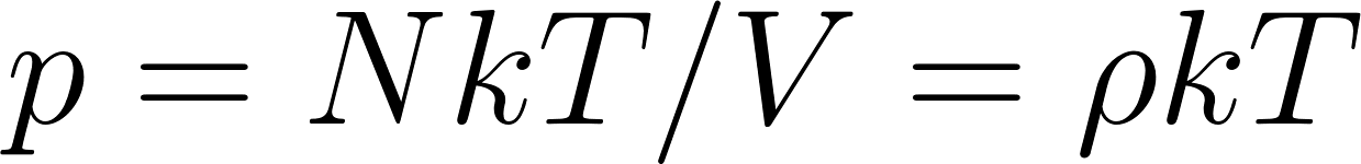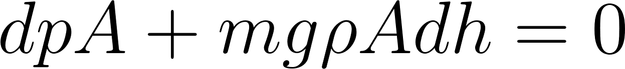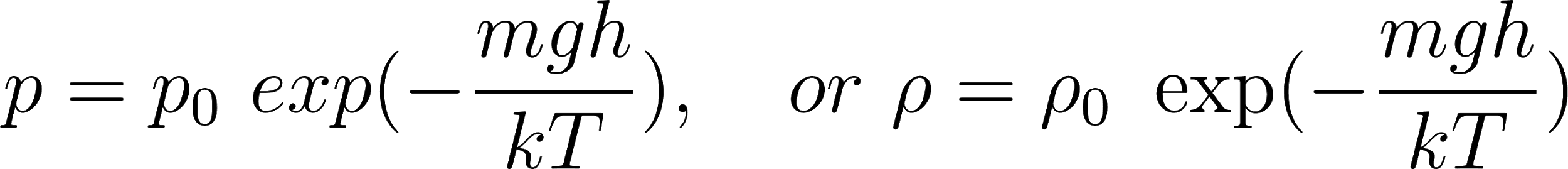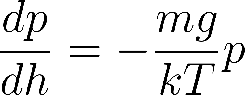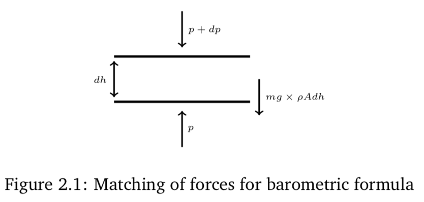First consider the barometric formula which gives the density (or pressure) of air at a height h above the surface of Earth. We assume complete equilibrium, mechanical and thermal. The argument is illustrated in Fig. 2.1. We consider a layer of air, with horizontal cross sectional area A and height . If we take the molecules to have a mass m and the number density of particles to be