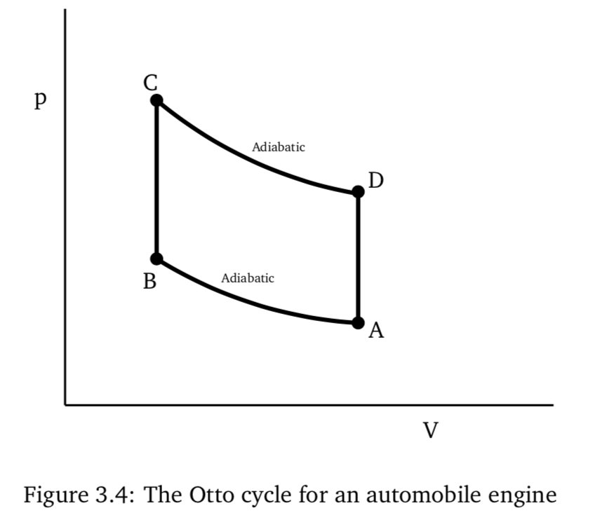 The automobile engine operates in four steps, with the injection of the fuel-air mixture into the cylinder. It undergoes compression which can be idealized as being adiabatic. The ignition then raises the pressure to a high value with almost no change of volume. The high pressure mixture rapidly expands, which is again almost adiabatic. This is the power stroke driving the piston down, The final step is the exhaust when the spent fuel is removed from the cylinder. This step happens without much change of volume. This process is shown in Fig. 3.4. We will calculate the efficiency of the engine, taking the working material to be an ideal gas.