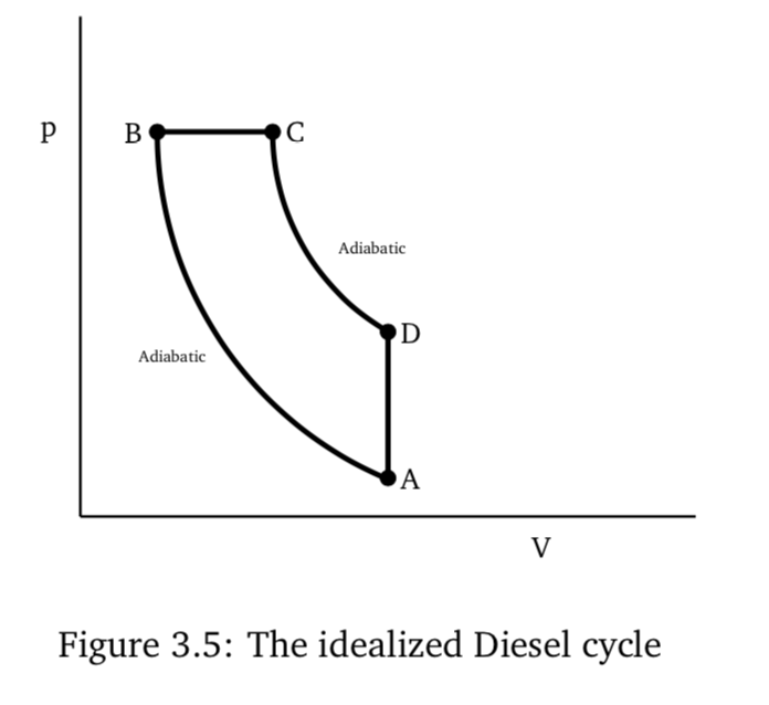 The idealized operation of a diesel engine is shown in Fig. 3.5. Initially only air is admitted into the cylinder. It is then compressed adiabatically to very high pressure (and hence very high temperature). Fuel is then injected into the cylinder. The temperature in the cylinder is high enough to ignite the fuel. The injection of the fuel is controlled so that the burning happens at essentially constant pressure ( to