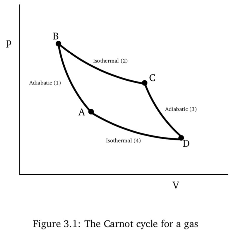 This is an idealized engine, no real engine can be perfectly reversible. The utility of the Carnot engine is to give the framework and logic of the arguments related to the second law of thermodynamics. We may say it is a gedanken engine. The processes involved in the Carnot cycle may refer to compression and expansion if the material is a gas; in this case, the cycle can be illustrated in a diagram as shown in Fig. 3.1. But any other pair of thermodynamic variables will do as well. We can think of a Carnot cycle utilizing magnetization and magnetic field, or surface tension and area, or one could consider an electrochemical cell.