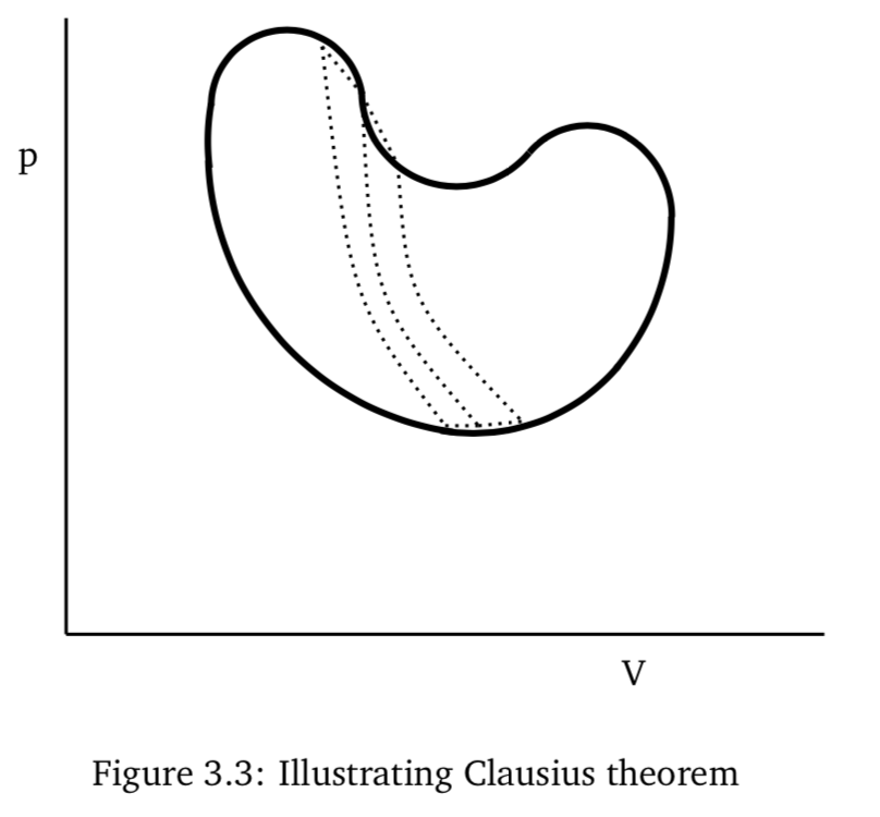 where we denote the heat absorbed or given up during each infinitesimal step as . The statement in equation (3.15) is due to Clausius. The important thing is that this applies to any closed curve in the space of thermodynamic variables, provided the process is reversible.