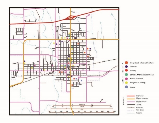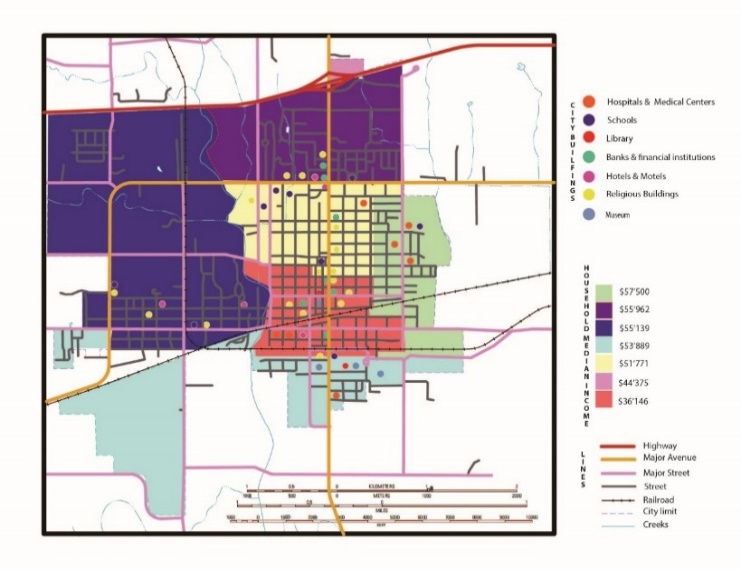 For assessing the placement of urban services in relation to social equity, we have prepared a map of urban services and important buildings in City of Abilene. By overlaying this map with the map of household median income and its relation to transportation and road hierarchy, we can assess the level of equity in access to urban service such as healthcare, education, food services and religious buildings.