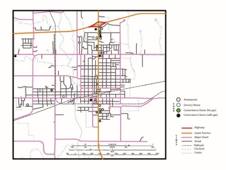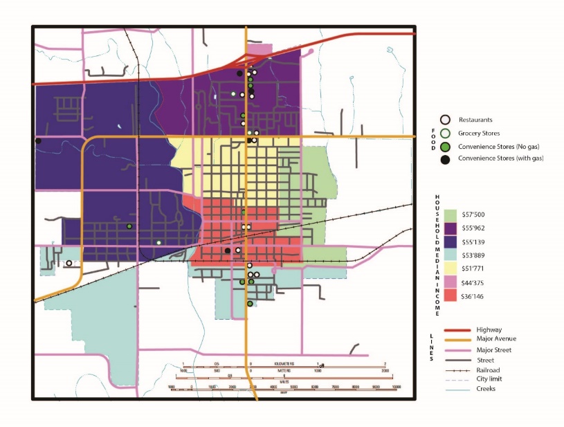 In Abilene, KS we can categorize food services to four type of convenience stores without gas, convenience stores with gas, grocery stores and restaurants. There are eight convenience stores (no gas), five convenience stores (with gas), three grocery stores and three grocery stores and fifteen full- service restaurants. As the number of number of these stores related to foods seems proper and enough for this city, but the placement of them are not reasonable. Most of these food services are located in north with residents with high median income; and then in south and after that in downtown. The east side of the city, the norther part of the center, doesn’t have even one type of these four categories of stores for food services, so residents who live in these areas should have car to have access to their daily needs of food service. It shows the car oriented city planning and design. These type of cities are designed for cars rather than for pedestrians.