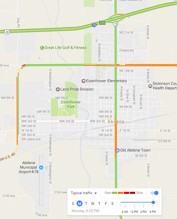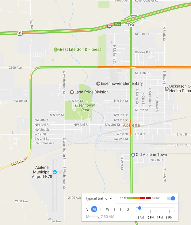 Transportation is the essential infrastructure for providing movement and access to urban resource. If transportation system is not accessible to all people, social equity can be damaged. In the city of Abilene, Kansas the three main road provide the main transportation of this city. The highway located in the north edge of the city provide the main access of this city with other cities. The other two main roads, Old US 40, from east to west and S Buckeye Ave from north to south are the two other main roads of the city. By assessing the relation of time with typical traffic routes from 7:30 AM to 8:00 pm, we can realize that these three main roads are the roads that gets used which is due to the lack of public transportation system.