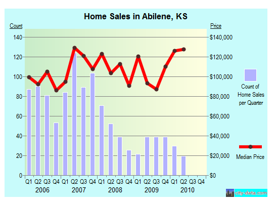 Housing and having a shelter to live is one the basic resource of human need for surviving. In this regard, having the equal access to a safe house with a proper quality should be considered in attaining social equity. In Abilene, Kansas number of houses is 3,126 (2,857 occupied: 1,875 owner occupied, 901 renter occupied), percentage of renters is 32%, Housing density is 757 houses/condos per square mile. Median household income for houses/condos with a mortgage is \$68,321 and median household income for apartments without a mortgage is \$48,641. Median monthly housing costs: \$616. Estimated median house or condo’ value in 2013 is \$117,376. Median number of rooms in houses and condos is 6.0. Median number of rooms in apartments: 4.1. Median household income in 2013 is \$ 50’876 in year. By looking at the diagram of home sales in Abilene, KS we can figure out that ability of buying home has been decreased in recent years, due to increasing the median price of homes. The ability of buying home or even renting home is directly related to household median income.