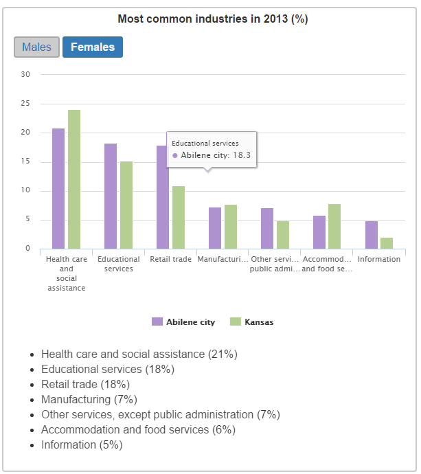 Figure 6. (Left) Most common industry in 2013 (%) in occupation of women in Abilene, KS