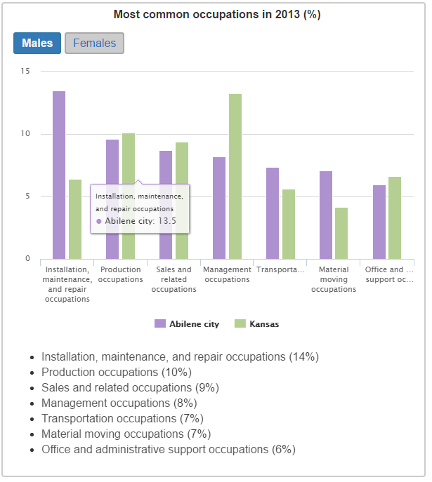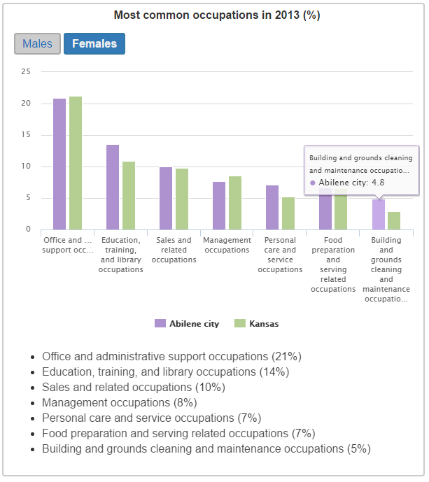 Figure 7. (Right) Most common occupation types in 2013 (%) of women in Abilene, KS