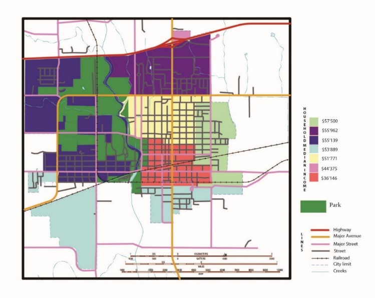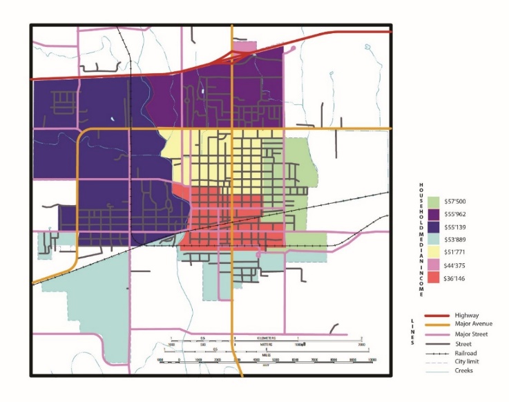 Physical access is an essential feature of an overall health system. Specially, in urgent situations, access to outpatient unit should be considered with a quick and close access. For analyzing spatial accessibility to healthcare centers, we look at the placement of health care centers and hospitals in Abilene, KS in the map of placement of important buildings and urban services, we can realize that some parts of the city doesn’t have a quick and close access to healthcare facilities. This city has six main medical centers. In the important building overlaid on household median income level, we can see three health care centers only in the area with highest income level which is half of the number of medical centers of this city. The people higher income level has more and easier access to healthcare facilities and it is another form of social inequity. Even at the west and north side of the city which residents have high level of income but they are in second and third place of median income, access to medical and healthcare centers is hard and we can see the lack of medical centers at these areas.