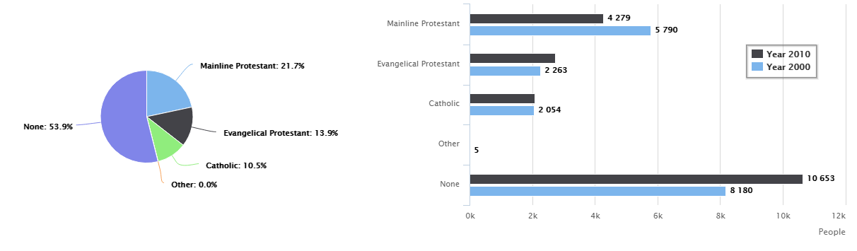The majority of residents in Abilene, KS are not religious who are 53.9% of the population. The remaining population are protestant (21.3% of population are mainline protestant and 13.9% are evangelical protestant), the minority are Catholic (10.5%). In this city which only 46.1% of its population are religious who are Christian, we can see seventeen religious buildings and Church which are approximately distributed equitably in the city. By looking carefully, we can see most of the churches are located in the center of the city which is the older part and most of it are remaining from the past. In the newer section of the city in the east part and a section of west edge in which wealthy people live, there is no church added in the modern part of the city which reflects the needs of 53.9% of the people who are not religious in new development of the city.