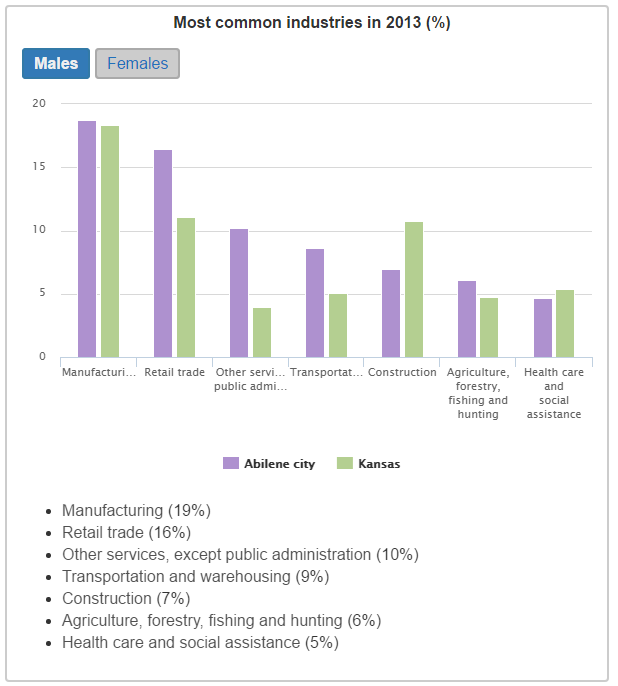 Figure 4. (Left) Most common industry in 2013 (%) in occupation of men in Abilene, KS
