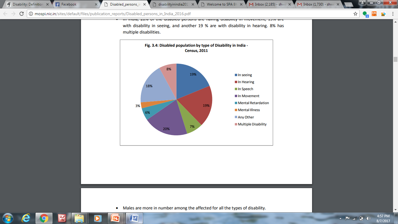 According to RPWD Act 2016, “person with disability’ means a person suffering from not less than 40% of any disability as certified by the medical authority (certified any hospital or institution , specified for the purpose of this act by notification by the appropriate Government). As per Census 2011, in India, out of the 1.21 billion population, about 26.8 million persons are ‘disabled’ which is 2.21% of the total population. Among the disabled population 56% (15 million) are males and 44% (12 million ) are females. In the total population, the male and female populations are 51% and 49% respectively. In Census 2011 information on eight types of disability (disability in seeing, in hearing, in speech, in movement, in mental retardation, in mental illness, any other and multiple disability) has been collected. In India, 20% of the disabled persons are having disability in movement, 19% are with disability in seeing, and another 19 % are with disability in hearing. 8% has multiple disabilities. The percentage of persons having disability in movement is the highest among all the other disabilities.