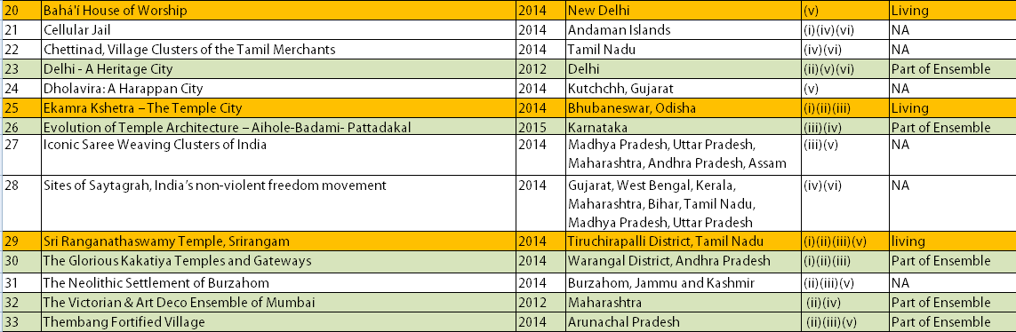 ICCROM Forum (2005) of Living Religious Heritage states that understanding heritage of religious interest requires recognizing that the intangible significance of tangible religious objects, structures and places is the key to their meaning. It also requires sensitivity to the overall cultural historical context to properly appreciate the spirit of a place and its symbolic significance, beyond its material existence. Jokilehto (2010), defines living religious heritage "is the tangible and intangible embodiment of the many and diverse faiths which have sustained human life through time. It is of particular importance, given its vital role in conveying, expressing, and sustaining the faiths which give spiritual identity, meaning and purpose to human life. The tangible and intangible cannot be separated since all cultural material has intangible value. The religious forces are based on belief systems which have been at ‘the core of our life’, and noting that any form of living heritage is inseparable from the frameworks of religion or belief system of its society. In living heritage sites associational value is important as it majorly contributes to the continued existence of the site. The religious heritage discourse is an extremely sensitive area which is associated with the faith, religious values and the religious laws that might challenge the professional conservationists in intervening with the religious properties. The living religious places in UNESCO's World Heritage List placed for (1) Religious and spiritual significance; (2) Integral part of larger ensembles, such as historic cities, cultural landscapes and natural sites. A detailed list of nominated and tentative World heritage sites in India, cultural importance was prepared categorizing the sites based on the religious and spiritual significance and integral part of larger ensembles. Out of the 28 nominated sites of cultural importance, 4 sites are classified as living religious and 12 as integral part of larger ensembles. Refer table 1.