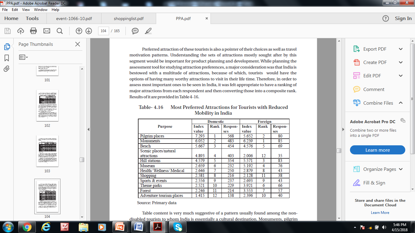 In 2010 Accessible Tourism in India, under Indian Institute of Tourism and Travel Management conducted a study commissioned by Ministry of Tourism on “Problems and Prospects of Accessible Tourism in India.” The study was conducted on six attraction : Taj Mahal, Amber Fort, Qutub Minar, Sun temple, Mamallapuram , Old Goa churches for a total of 1205 tourists with reduced mobility Mostly the purpose of travel is leisure, but for domestic tourist religious attractions are higher, and next attraction is culture base and vice a versa for foreign tourists. Refer Table 3.