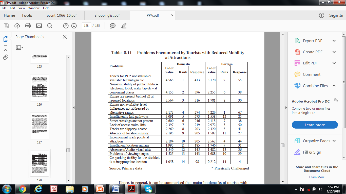 Table 4: Problems faced by tourists with reduced mobility at World heritage sites in India (Accessible Tourism in India 2010)