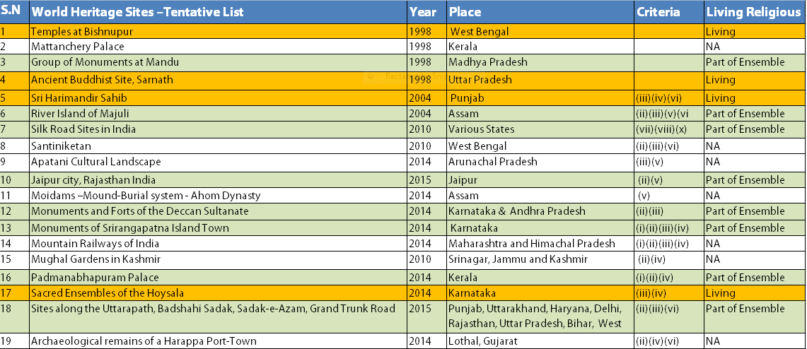 Table 2. List of Tentative World heritage sites showing the Living Religious sites in India
