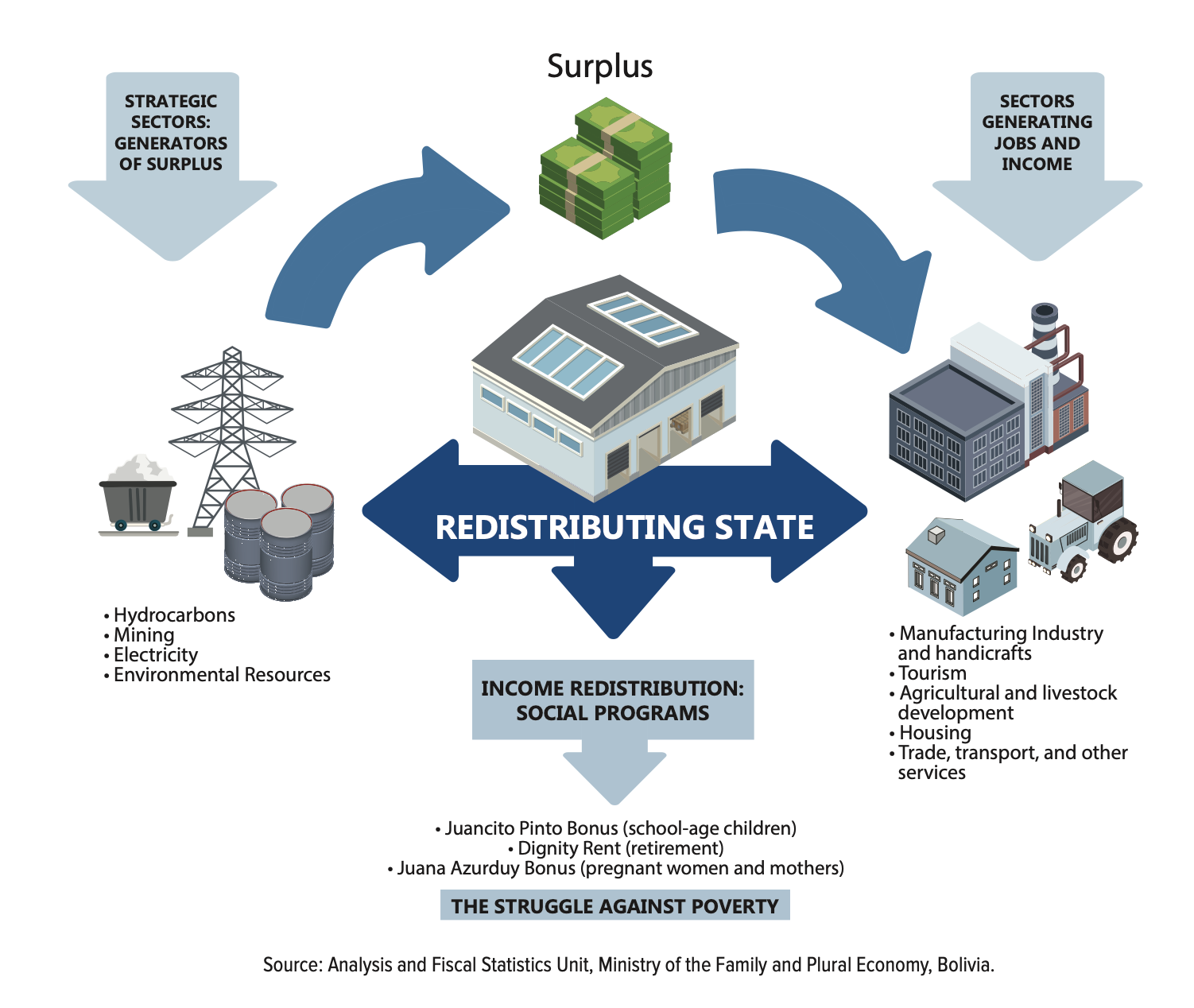 Leftism as redistribution: The core of left populist economic policies in the redistribution of wealth to the poorest sectors of society. In Bolivia, the primary means for this has been three cash-grant programs targeting demographic sectors of the public: The Dignity Pension (Renta Dignidad) offers a monthly payment to citizens over 60; The Juana de Azurduy Bonus provides cash payments to pregnant women and new mothers, conditional on receiving prenatal care, and the Juancito Pinto Bonus provide cash payments to families with small children attending school. These programs, combined with a rapidly rising minimum wage, reduced extreme poverty in Bolivia from 38.6% of the population to 16.8% over ten years.30 They parallel efforts in the softer end of the Pink Tide, notably Zero Hunger (Fome Zero) in Workers’ Party-led Brazil.