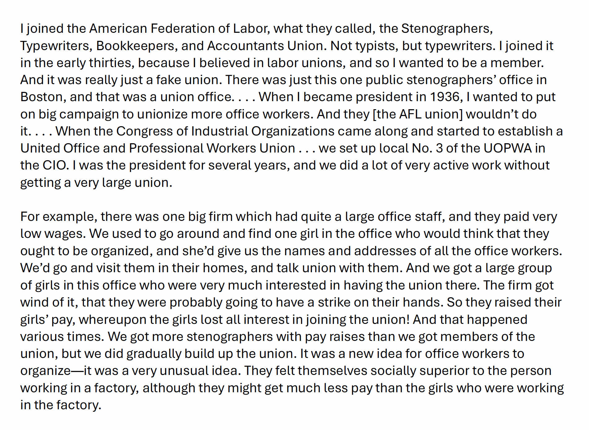 Florence Luscomb, for example, earned an architecture degree from MIT in 1909 but soon abandoned architecture (at that time, a very unusual occupation for a woman), first to campaign for women’s suffrage and later to work for prison reform. When the CIO started the United Office and Professional Workers’ Union, Luscomb became president of the Boston local. Although she helped to win higher pay, she had trouble building a large union. One problem was that female clerical workers often felt socially superior to factory workers and above trade unionism; another was that stenographers and typists worked in isolated settings and small groups. And as Luscomb later recalled, “the CIO didn’t give much assistance in having secretaries organized; they’d be too busy trying to organize the textile workers, and the railroad workers, and large ‘important’ bodies of the working class.”