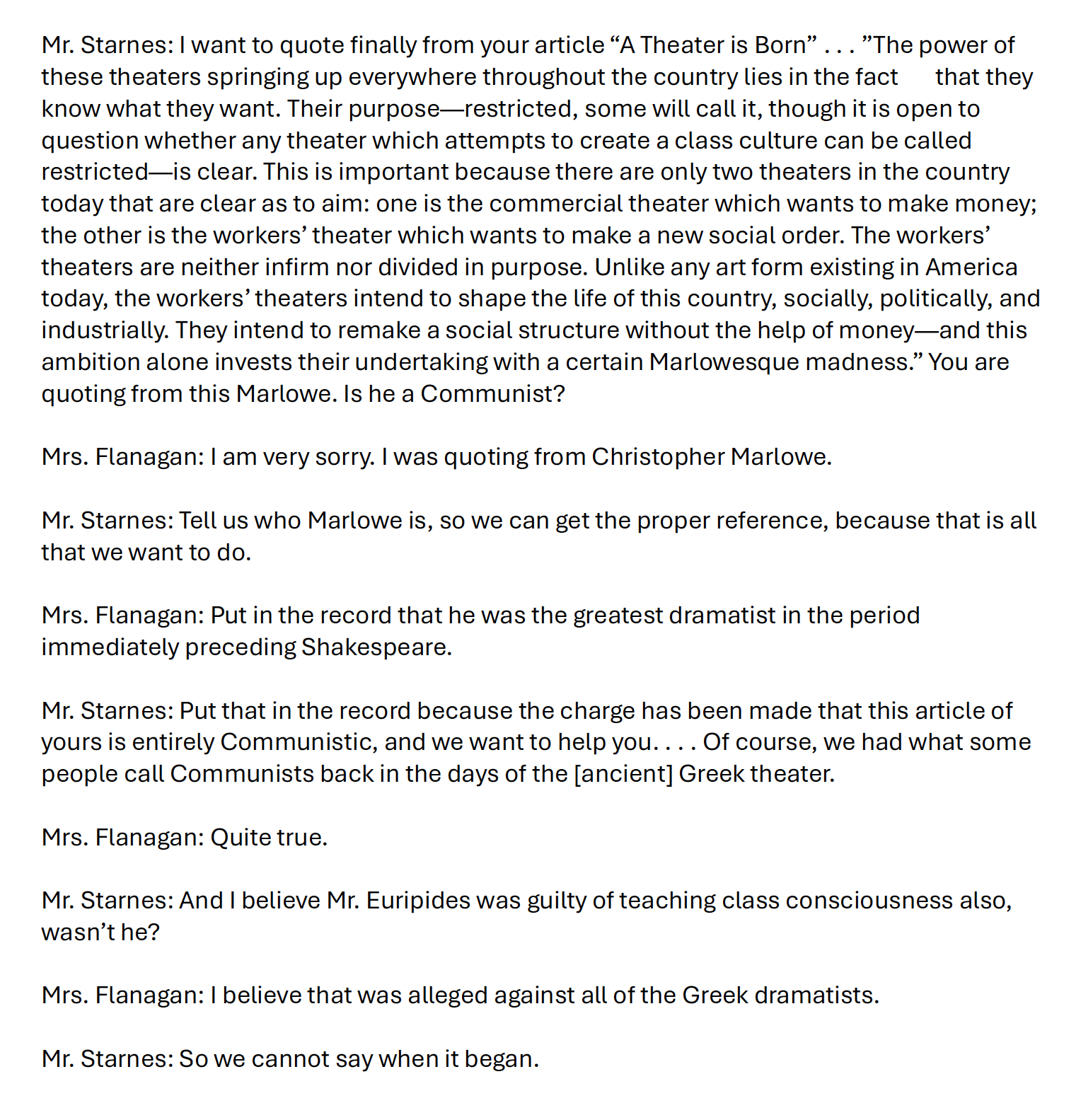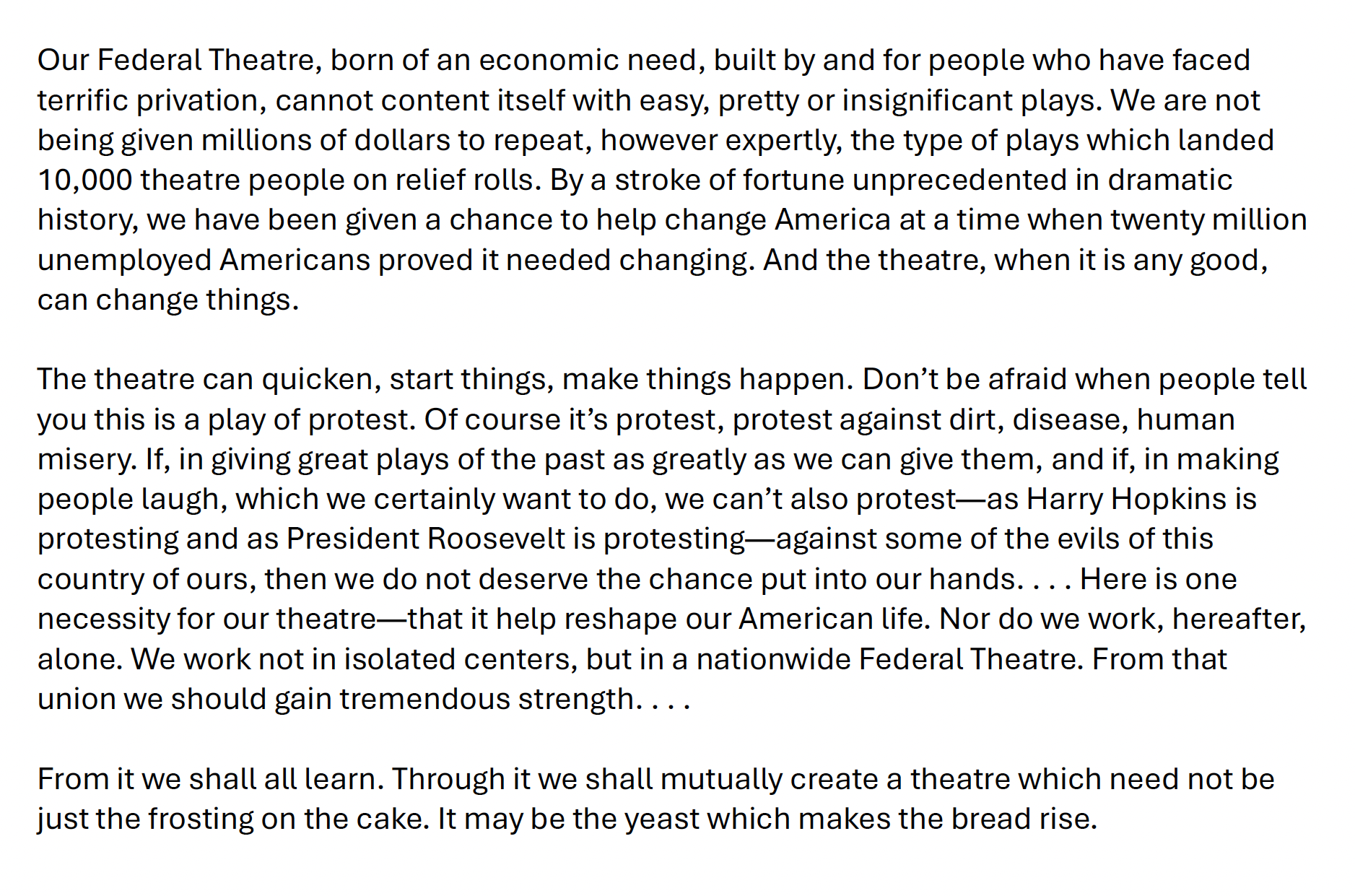 The government supported dramatic arts through the WPA’s Federal Theatre Project, which hired actors, writers, and directors from the relief rolls. It produced classics by Shakespeare, Molière, and Marlowe, as well as socially avant-garde works such as the “Living Newspaper” plays and Sinclair Lewis’s It Can’t Happen Here, a drama about fascism coming to America. Many plays were produced in multiple versions, with African American, Spanish, and Yiddish casts. Led by Hallie Flanagan, the exuberant, politically engaged director of Vassar College’s Experimental Theatre, the Federal Theatre Project became a lightning rod for conservative criticism of the New Deal, both because it employed so many radicals and bohemians and because many Americans thought that theatrical work was hardly work at all.