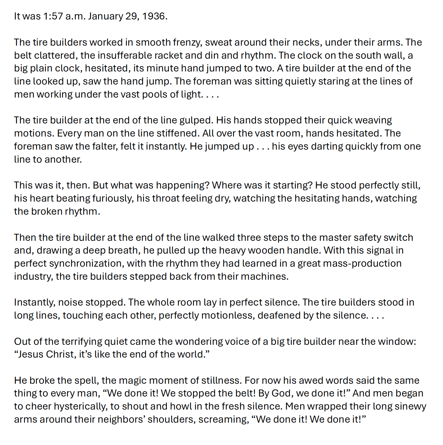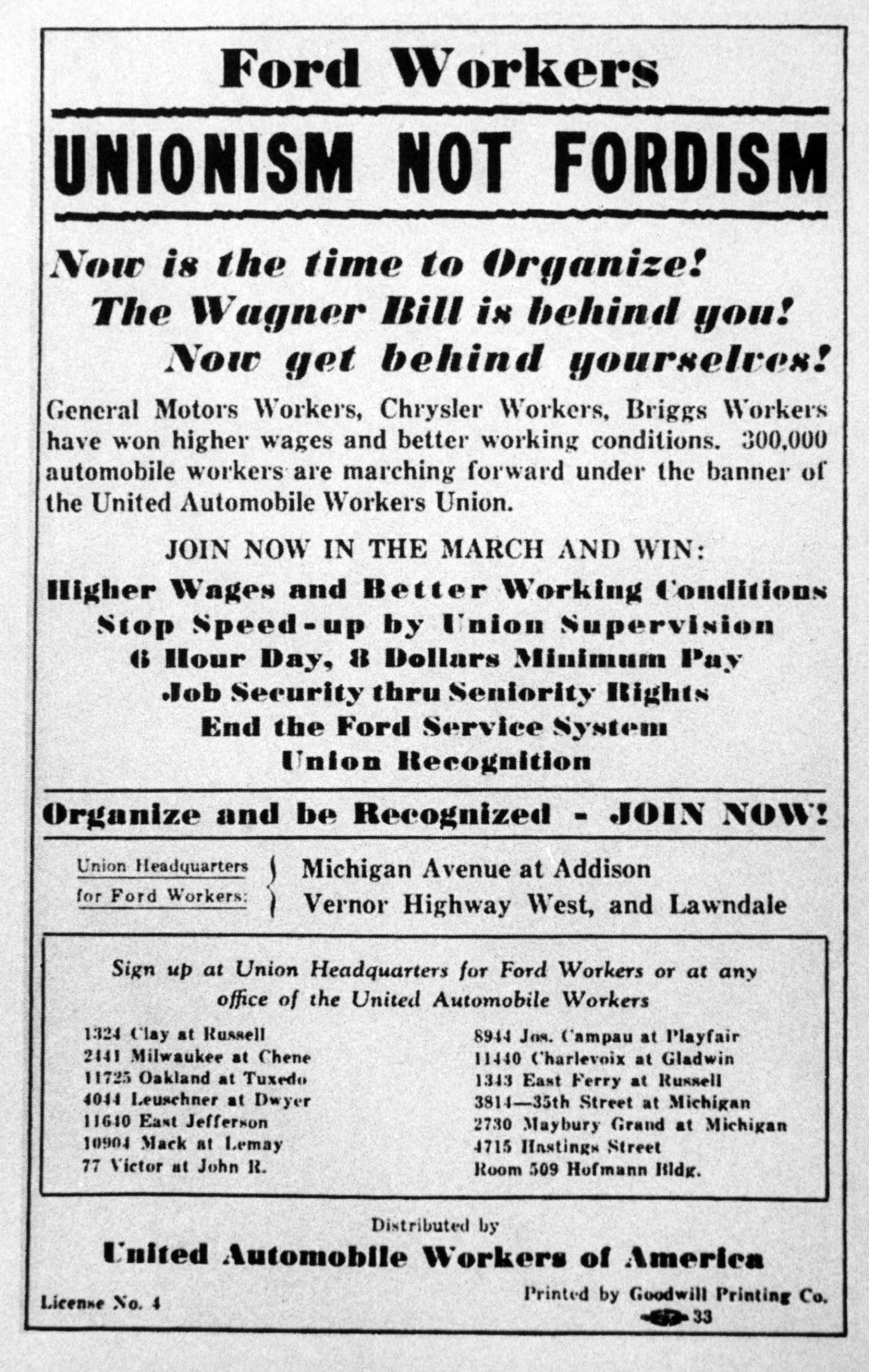 Autoworkers sought to counter GM’s enormous power with a companywide industrial trade union that could defend their dignity on the shop floor, their job after layoffs, and their standard of living in the community. The grievances of these relatively well-paid workers did not involve wages so much as arbitrary supervision, economic insecurity, and the dehumanizing speedup that was characteristic of assembly-line production. The foremen “treated us like a bunch of coolies [Chinese peasants],” a Chevrolet employee later remembered. “‘Get it out. If you cannot get it out, there are people outside who will get it out.’ That was their whole theme.” Because of the industry’s seasonal production cycle, employees worked long, hard hours during the winter and spring, only to be laid off for up to three months while the company retooled the factories during the off season. “The fear of being laid off,” one journalist noted, “hangs over the head of every worker. He does not know when the sword will fall.”
