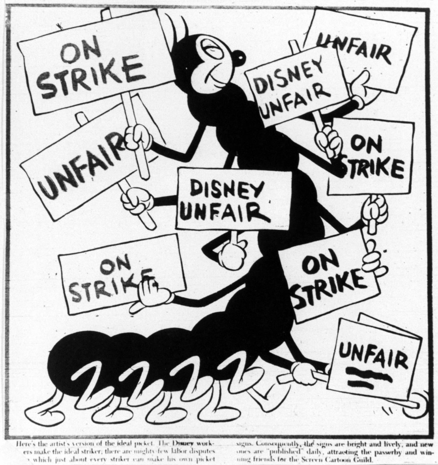 In 1941, trade union activism reached the workplace where some of the nation’s favorite fantasies were produced. After Walt Disney fired union organizers on his art staff, his studio cartoonists went on strike. This cartoon from a newspaper report indicated how Disney strikers brought new skills to labor organizing. “There are mighty few labor disputes,” the caption stated, “in which just about every striker can make his own picket signs. Consequently, the signs are bright and lively . . . attracting the passerby and winning friends for the Screen Cartoon Guild.”