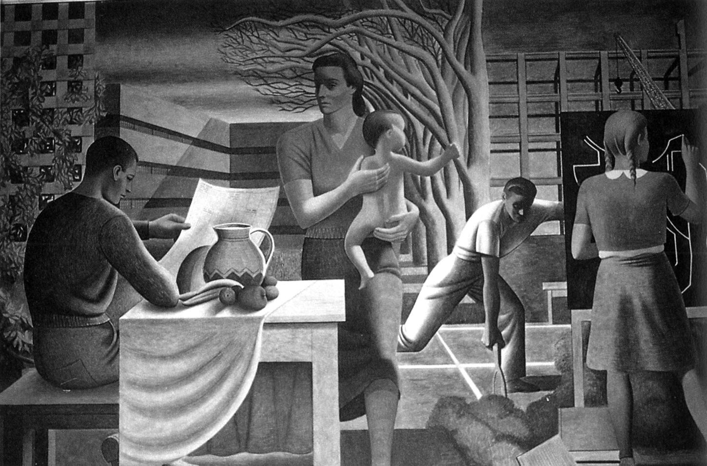 New Deal public art often reinforced traditional ideas about the roles of men and women in U.S. society. Seymour Fogel’s Security of the Family, a mural at the main entrance of the Social Security Building, shows a man seated at a plentiful table reading a newspaper, a symbol of engagement with the public world. A woman stands on the other side of the table, cradling a baby, while children conspicuously play and study nearby. Instead of acknowledging women’s work outside the home, in the face of economic and social crisis Fogel’s mural heralds men’s productive labor as the bulwark of the American family and future of the next generation.