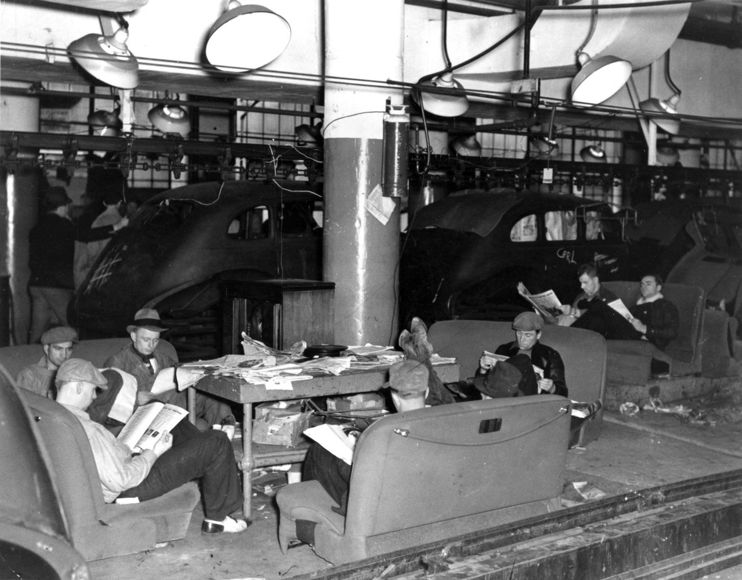 After FDR’s big victory in November, autoworker strikes began to multiply throughout the industrial Midwest. Some were planned and authorized by leaders of the fledgling United Auto Workers (UAW), but many were organized by shop militants who understood all too well the impatience and grievances of their workmates. Soon, one General Motors plant after another was shut down, often by workers who remained inside to occupy the factory. These “sit-down” strikes, first attempted in 1935 in Akron’s rubber factories, were an innovative tactic that prevented companies from replacing strikers with scabs. It also discouraged the use of violence, because the deployment of police, troops, or other armed groups to oust the men could result in damage to expensive company-owned buildings, machinery, and materials. Occupying corporate property was illegal, but strikers responded that management’s failure to abide by the new Wagner Act was a violation of the law as well.